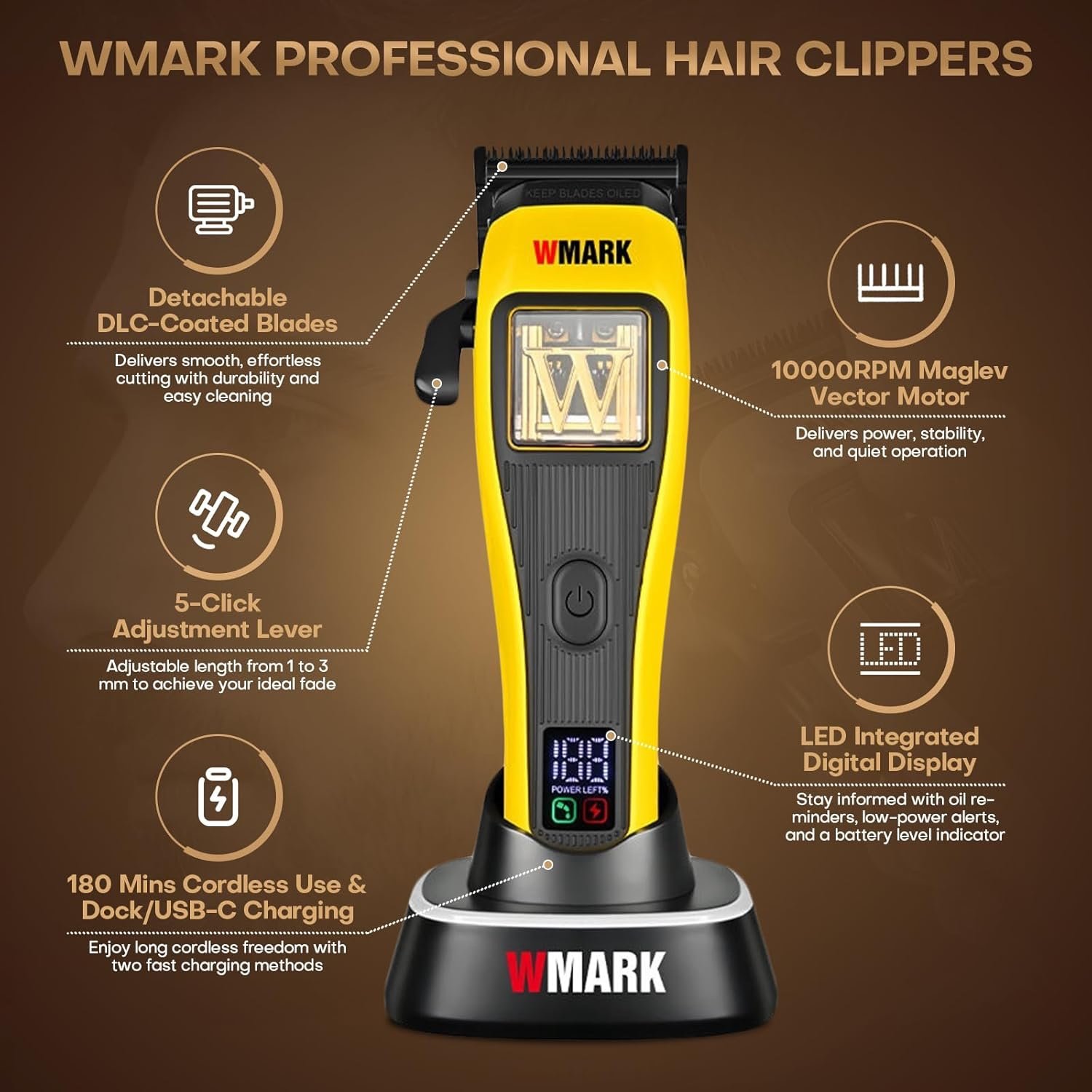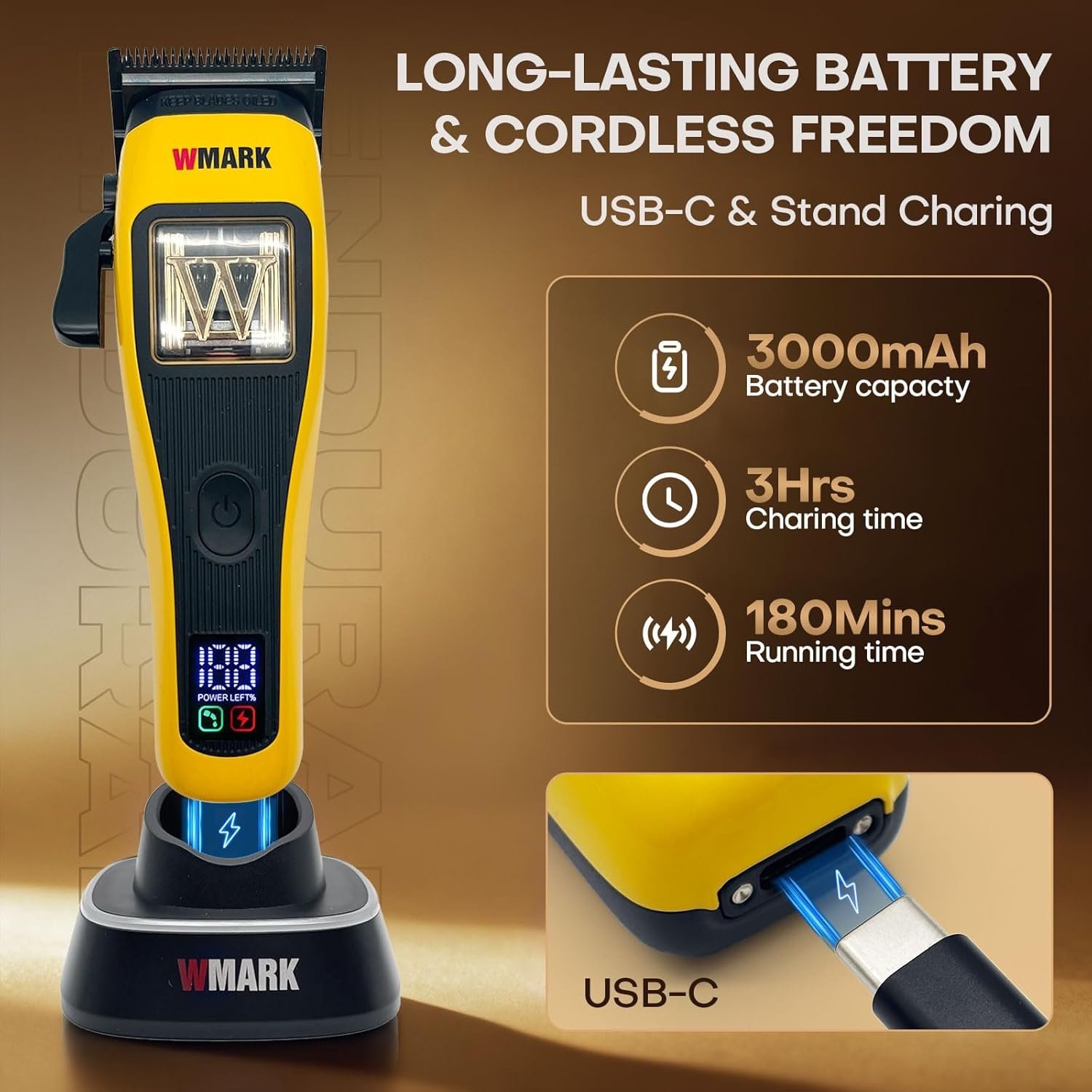 • LONG-LASTING CHARGE & FLEXIBLE CHARGING – Enjoy the freedom of up to 180 minutes of cordless use. The 3000mAh lithium-ion battery in these rechargeable hair clippers supports quick replenishment through a USB-C/dock, delivering reliable power