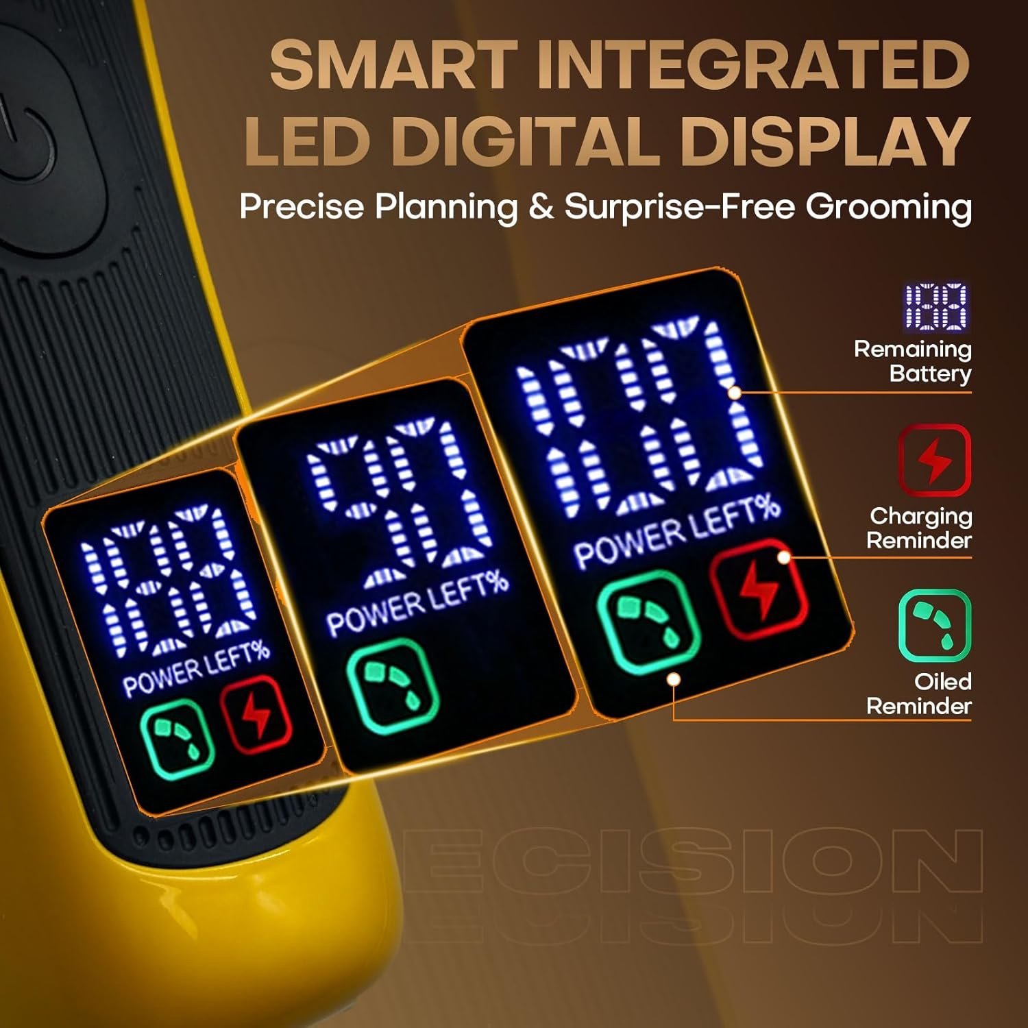 • SMART LED – CLEAR BATTERY & STATUS AT A GLANCE – Stay in control with the integrated LED display. It keeps you informed with key data like battery percentage, oil reminders, and low-battery alerts, allowing for precise planning and uninterrupted grooming without surprises